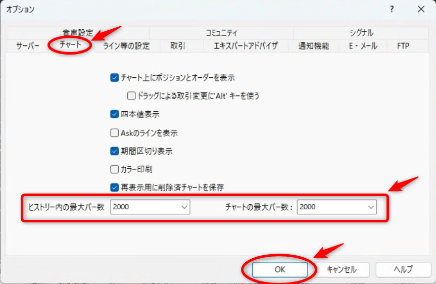 「チャート」タブの「ヒストリー内の最大バー数」「チャートの最大バー数」を2000まで減らして「OK」ボタンをクリックし、MT4を再起動します。