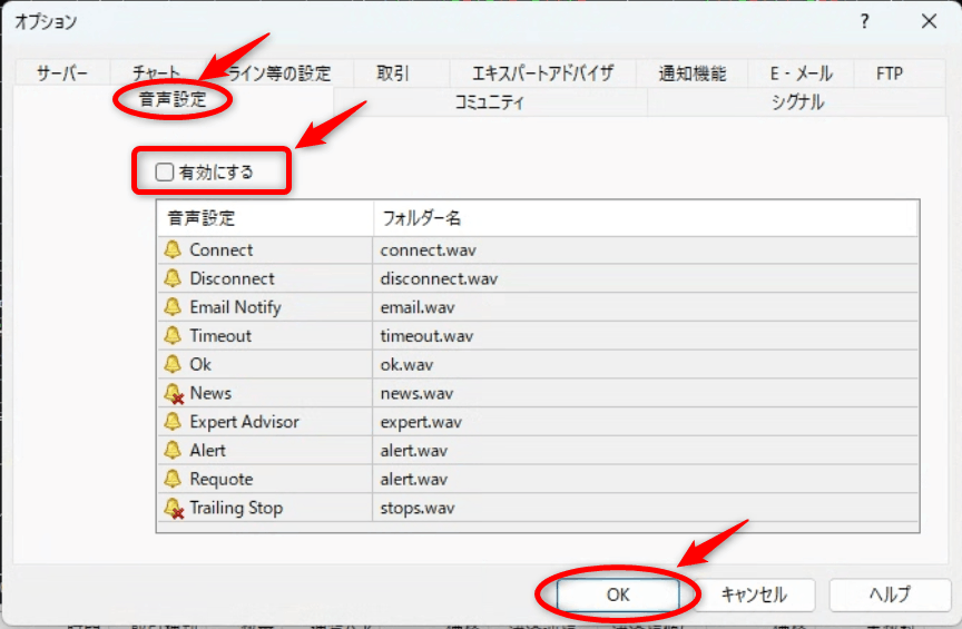 また、音声をオフにすることでもメモリへの負担を軽くできます!「音声設定」タブの「有効にする」のチェックを外して「OK」ボタンをクリックし、MT4を再起動します。