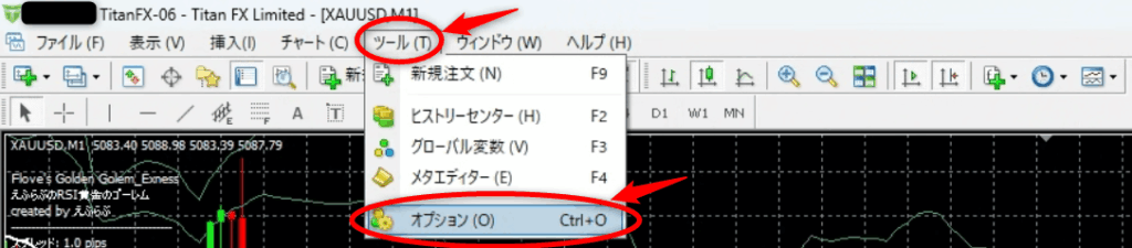 MT4上部メニュー「ツール」の「オプション」をクリックして開きます。