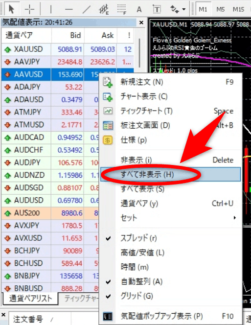 また、「気配値表示」や「ナビゲーター」などを使わない時は閉じておいた方がいいのですが、「気配値表示」に表示される通貨ペアが多ければ多いほどメモリへの負担が大きくなる為、閉じる前にすべて非表示にしておいた方がいいかと思います。