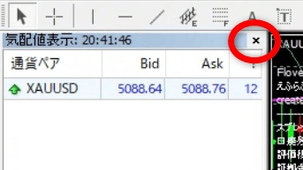 チャートに表示中の通貨ペア以外は全て非表示になるのを確認し(※)、☓ボタンを押して閉じておきます。