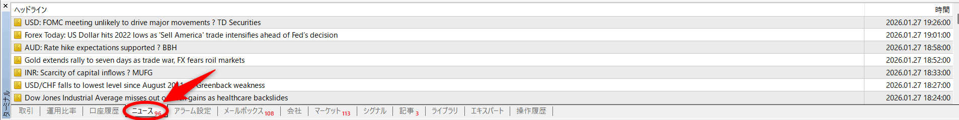 MT4のターミナルでは「ニュース」タブで為替関連のニュースが常時配信され続けるのですが、日本人トレーダーでここをずっと見てる人って一体どれだけいるんでしょうね?少なくとも私は全く見てませんw