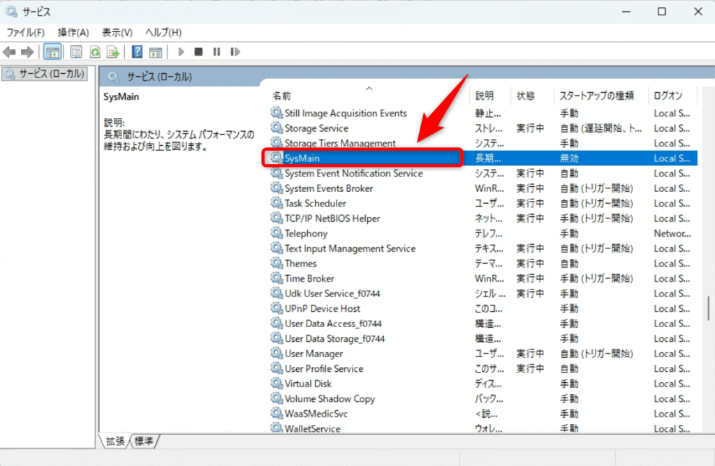 サービスの中にある「SysMain」(※)をダブルクリックしてプロパティ画面を表示させます。