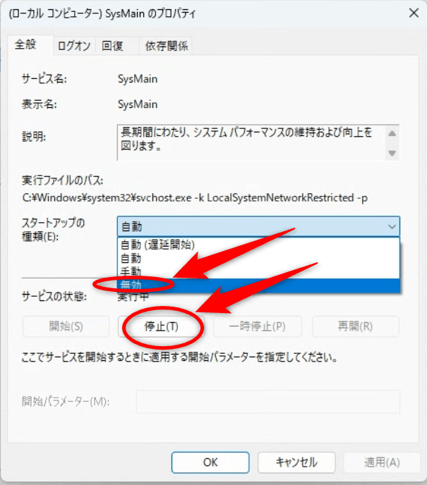 「スタートアップの種類」が無効以外だったら「無効」を選択し、「サービスの状態」が実行中だったら「停止」をクリックします。