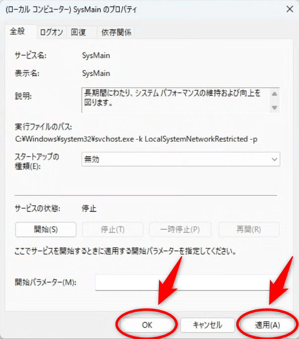 「スタートアップの種類」と「サービスの状態」が変更されたことを確認し、「適用」⇒「OK」の順にクリックしてプロパティを閉じます。