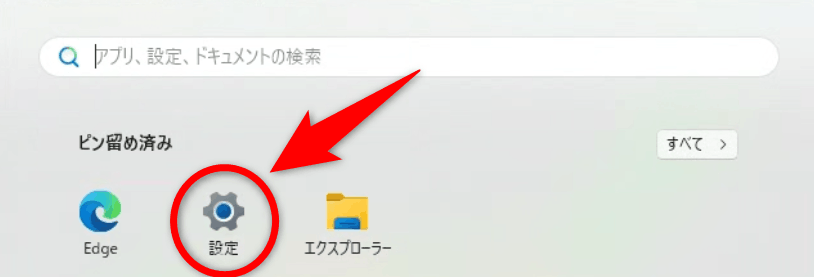 Windows11の場合、画面下にある以下スタートボタンから「設定」をクリックして設定画面を表示させます。
