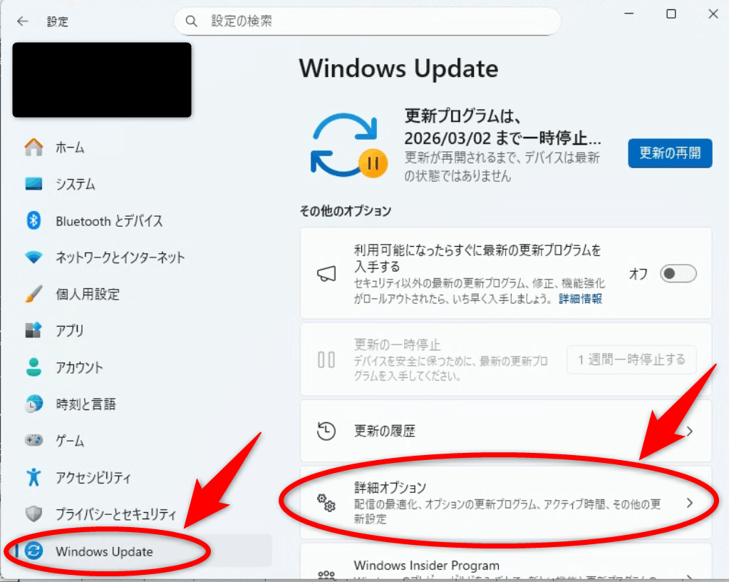 左側メニュー「Windows Updete」内の「詳細オプション」をクリックします。