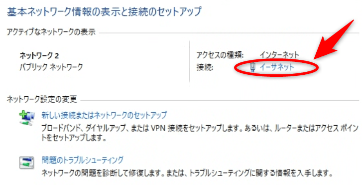 右上の方にある接続中の回線(下記では「イーサネット」)をクリックします。