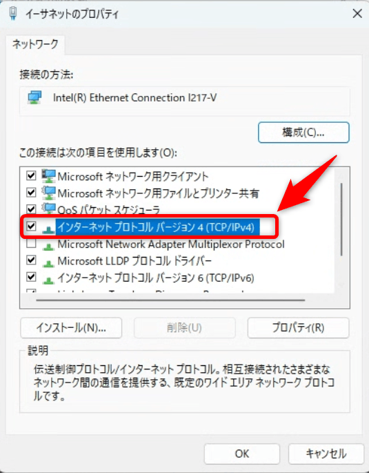 「インターネットプロトコルバージョン4(TCP/IPv4)」をダブルクリックします。
