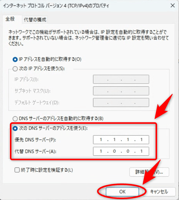 - 代替DNSサーバー:1.0.0.1
