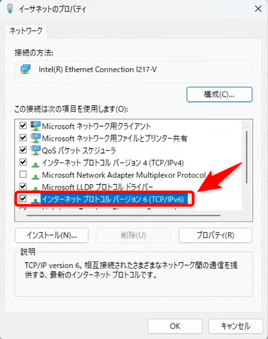 尚、回線のプロバイダーがIPv6にも対応してる場合、「インターネットプロトコルバージョン6(TCP/IPv6)」をダブルクリックします。
