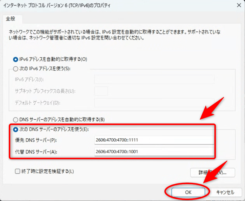 - 優先DNSサーバー:2606:4700:4700::1111