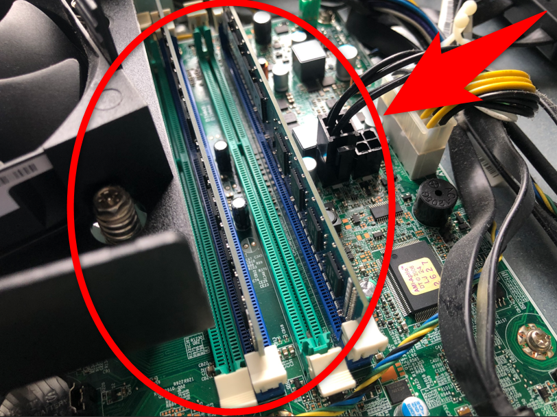 以下、私が常時使ってるサーバー用デスクトップPCの一つの中身を撮影した写真ですが、マザーボード(CPUやメモリなどを繋ぐ心臓部となる基板)にメモリスロットが4つあり(赤丸)、その内2つにメモリが刺さってて残り2つが空いてるのが見てわかるかと思います。