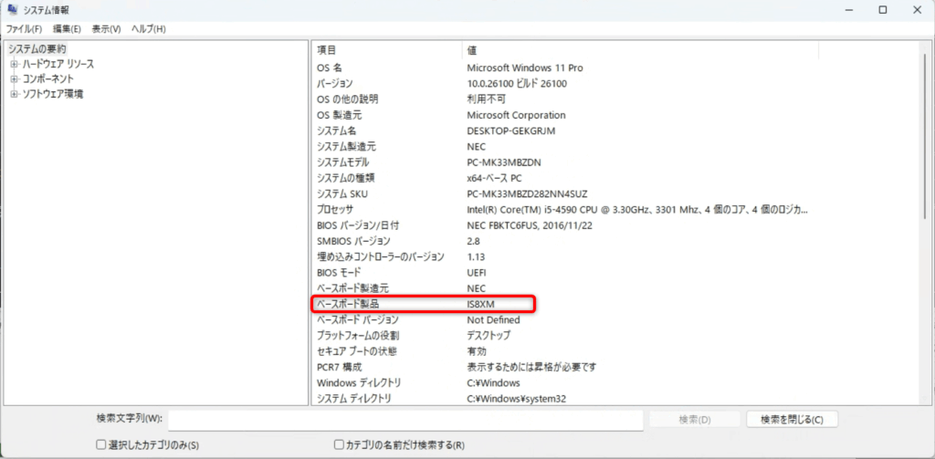 マザーボードの型番は「システム情報」の中にある「ベースボード製品」に記載されてます。