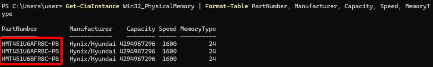 Get-CimInstance Win32_PhysicalMemory | Format-Table PartNumber, Manufacturer, Capacity, Speed, MemoryType