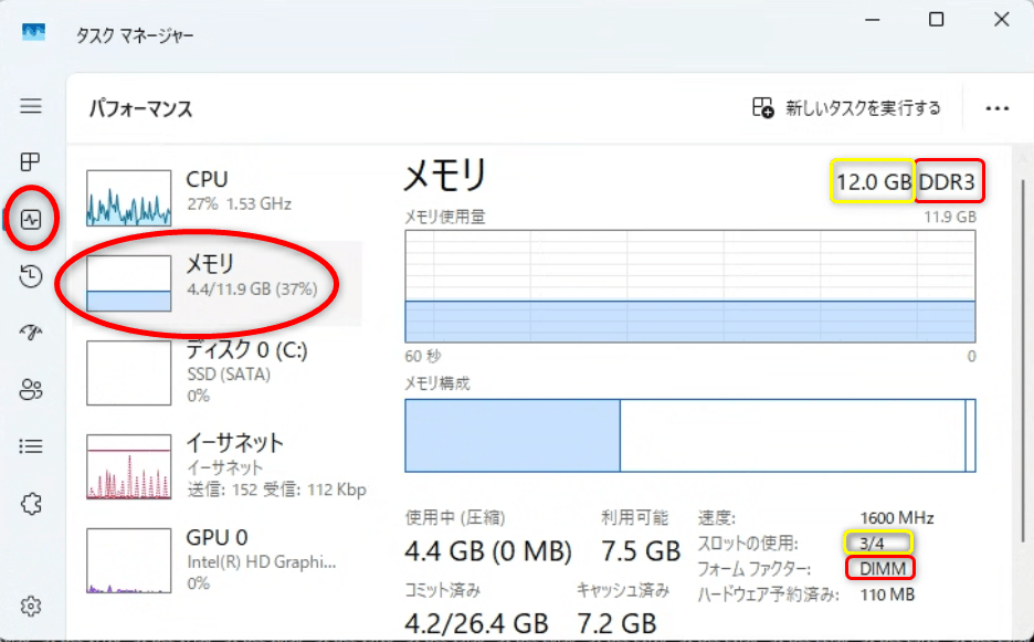「タスクマネージャー」にあるメモリのパフォーマンス画面で、右上の「DDR3」が規格、右下の「DDIM」が種類です。ちなみに、「12.0GB」というのは現在搭載されてるメモリ容量で、「3/4」というのは「メモリスロット4つのうち3つを使用してる」という意味です。