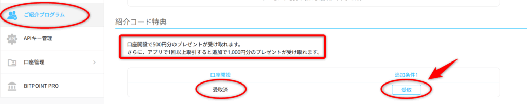 ちなみに、私もどこかの紹介コードを使わせて頂いて今回1500円をゲットしたのですが、紹介コードで口座開設後、会員ページの「ご紹介プログラム」で「受取」ボタンを押したらプレゼントを受け取りできます。