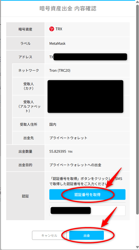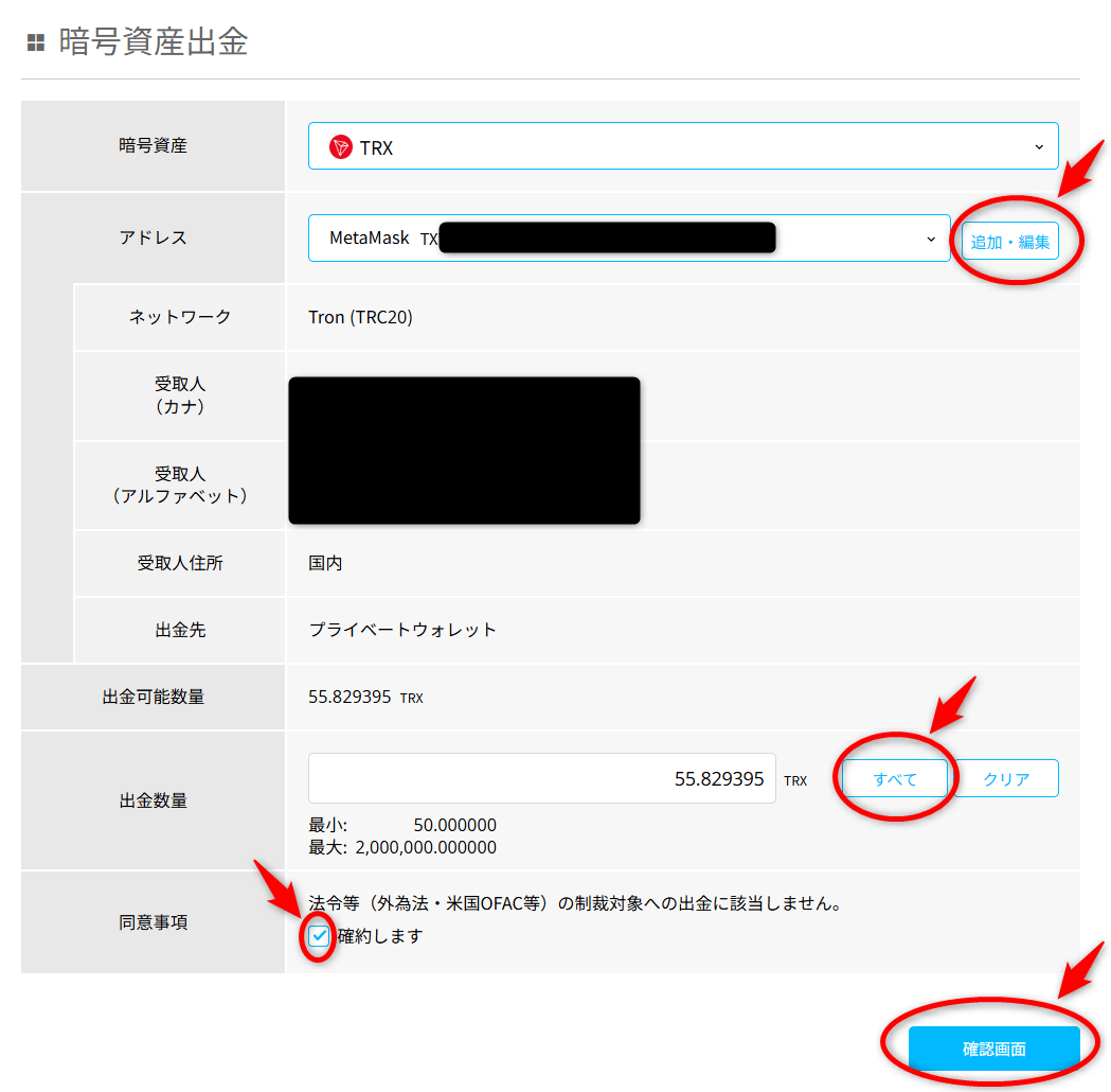 メタマスクのウォレットアドレス(イーサリアムネットワーク)と出金額(全額出金なら一番左端の金額をクリック)を入力し、下のチェックボックスにチェックを入れたら「出金する」ボタンをクリックします。