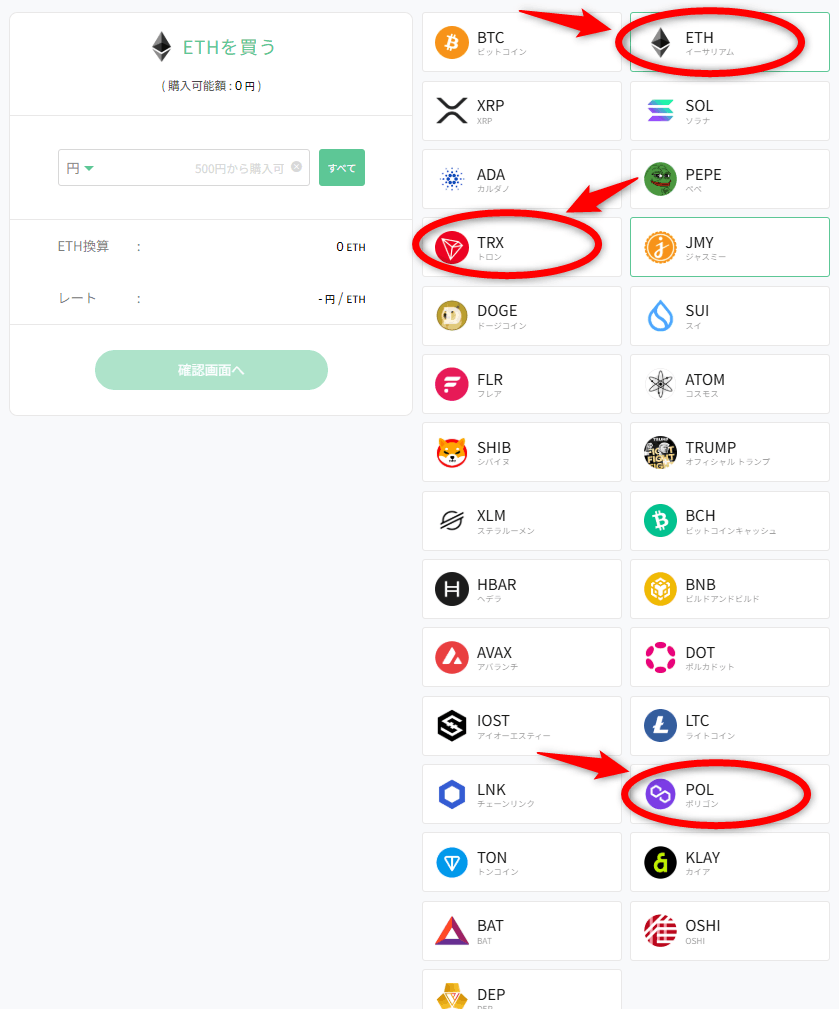 ※下記ではTRXを選択してますが、本記事記載のやり方で必要になるのはETHとPOLです。