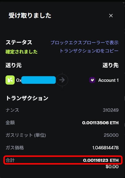 送金後にメタマスクで反映されてるのが確認できればガス代調達は完了です。