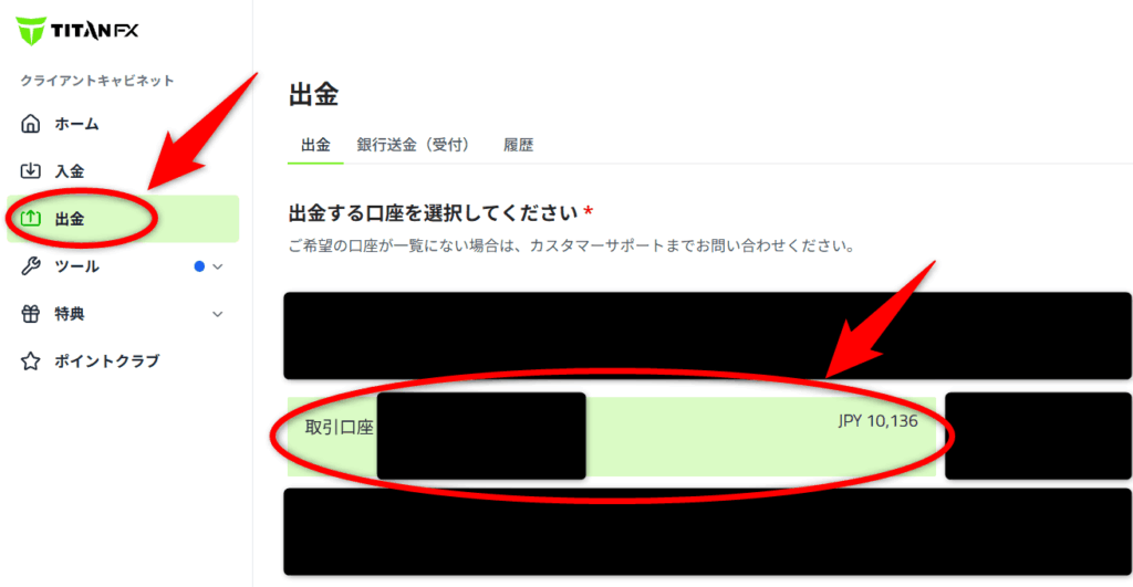 TitanFX会員ページへログインして「出金」ページを開き、出金する取引口座をクリックします。