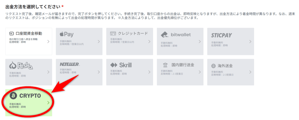 出金方法は「CRYPTO」をクリックします。