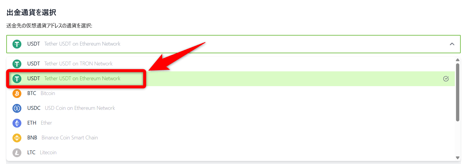 出金通貨を選択しますが、ここでは「USDT Tether USDT on Ethereum Network」をクリックします。