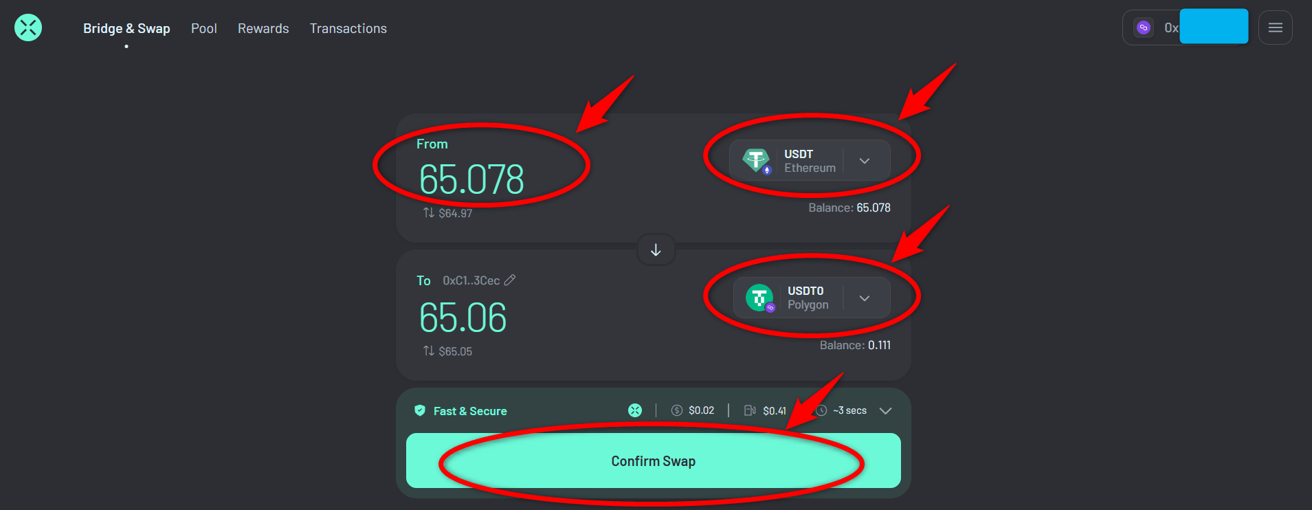 ・65.078314USDTをEthereumからPolygonへブリッジ ⇒ 手数料0.00053522ETH(約178円)、即時反映(※1)
