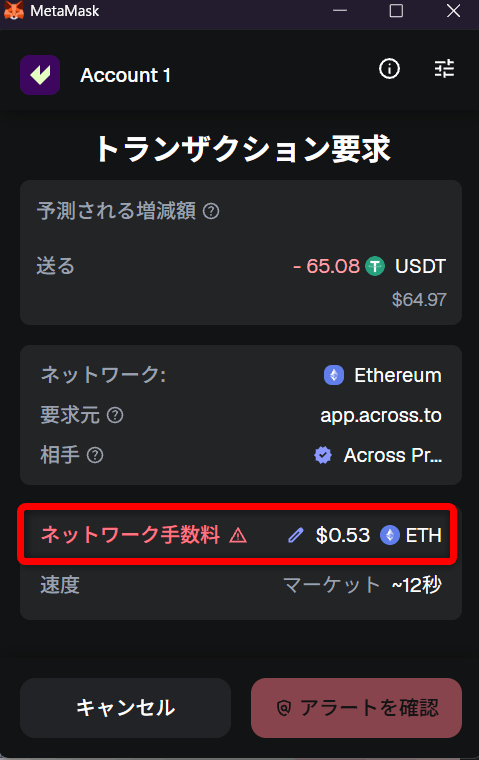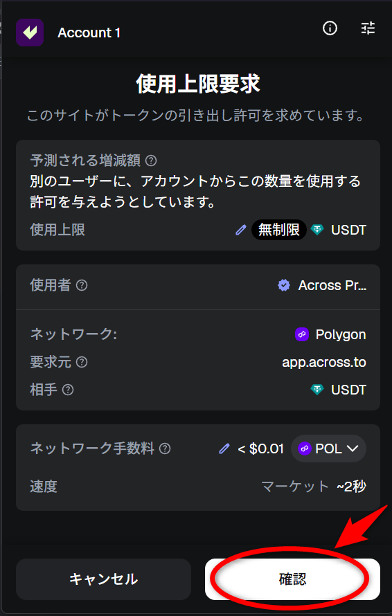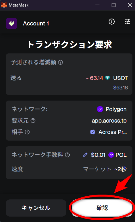 ここから再度Across Protocolのページに戻って「Confirm Swap」ボタンをクリックし、「トランザクションの要求」の画面が出てきたら「確認」ボタンをクリックします。