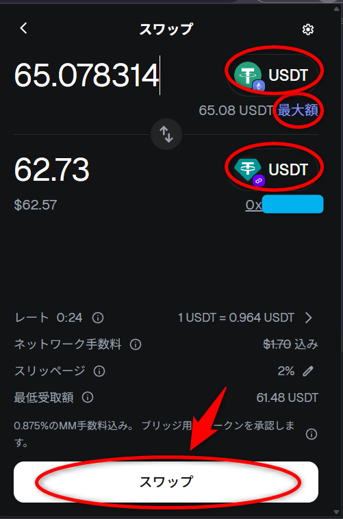 メタマスクのスワップ画面で、上はJPYC(ポリゴン)・下はUSDT(ポリゴン)を選択し、全額スワップする場合は「最大額」をクリックして全額表示させ、「スワップ」ボタンをクリックしたらすぐにスワップが行われます。