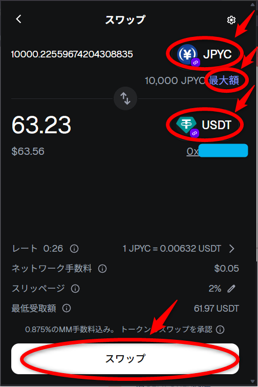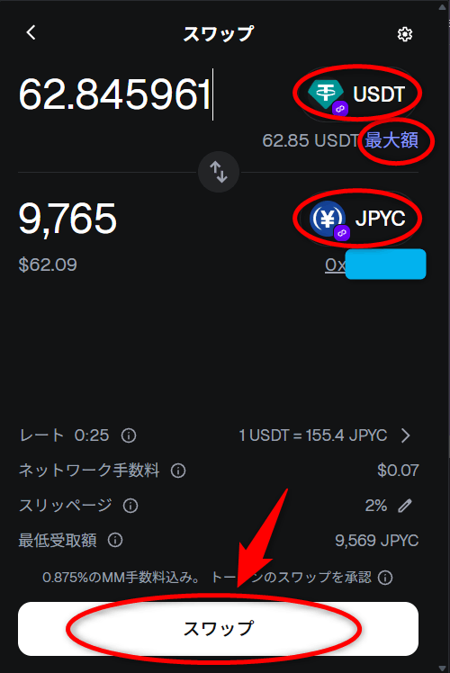 メタマスクでUSDT⇒JPYCへスワップ(交換)