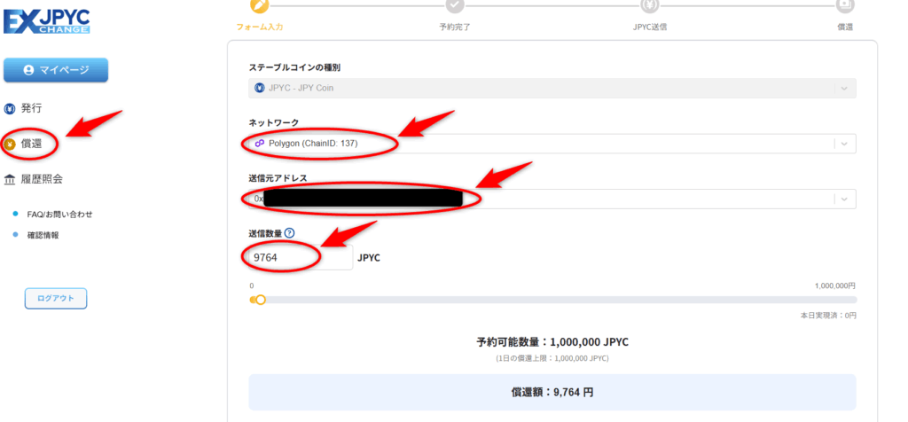 JPYC EXマイページへログインして「償還」ページを開き、「ネットワーク」(ここではPolygon)」、「送信元アドレス」(ここではメタマスクのアドレス)、「送信数量」(小数点以下は入力不可)を選択・入力します。