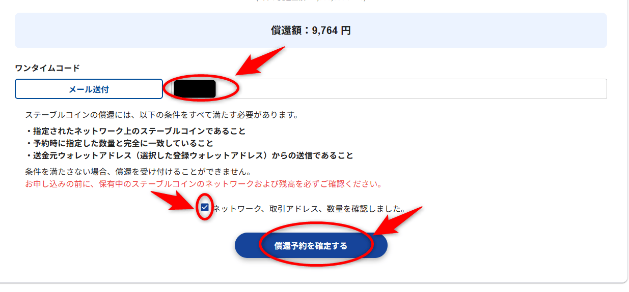 数字6桁のワンタイムパスワードを発行して入力できたら、下のチェックボックスにチェックを入れて「償還予約を確定する」ボタンをクリックします。