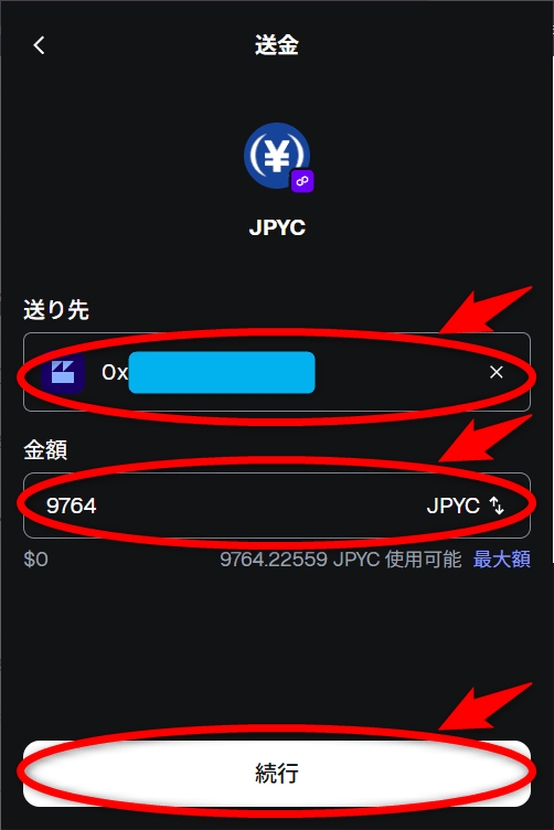 メタマスクの送金画面で、「送り先」(上記送金先アドレスのコピペ)、「金額」を入力したら「続行」ボタンをクリックし、次の確認画面の内容に問題がなければ「確認」ボタンをクリックします。