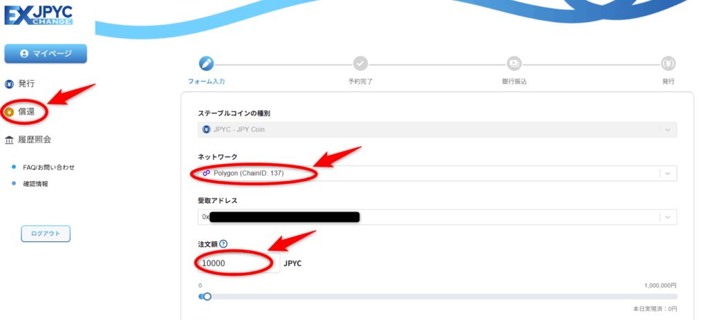 最後に、JPYC EXマイページから償還(出金)手続きを行います。