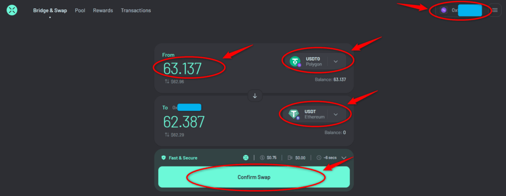 サイトの画面右上からメタマスクを接続し、上はUSDT(Polygon)・下はUSDT(Ethereum)を選択し、「From」にブリッジしたい金額を入力したら「Confirm Swap」ボタンをクリックします。