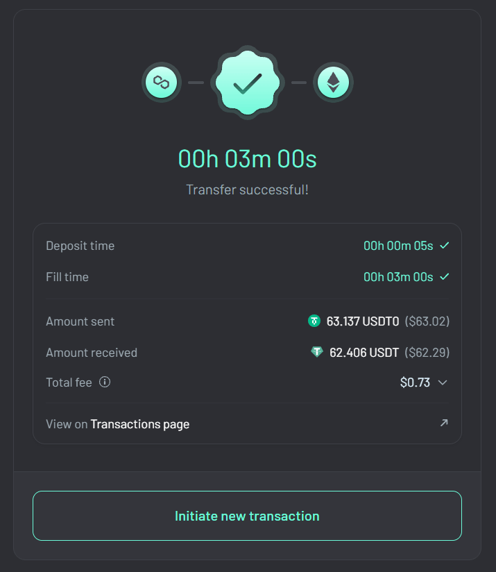 下記の画面になればUSDT(イーサリアム)へのブリッジは完了です。かかった時間は3分ちょうど、手数料は0.73ドル相当(POLで発生)となっています。