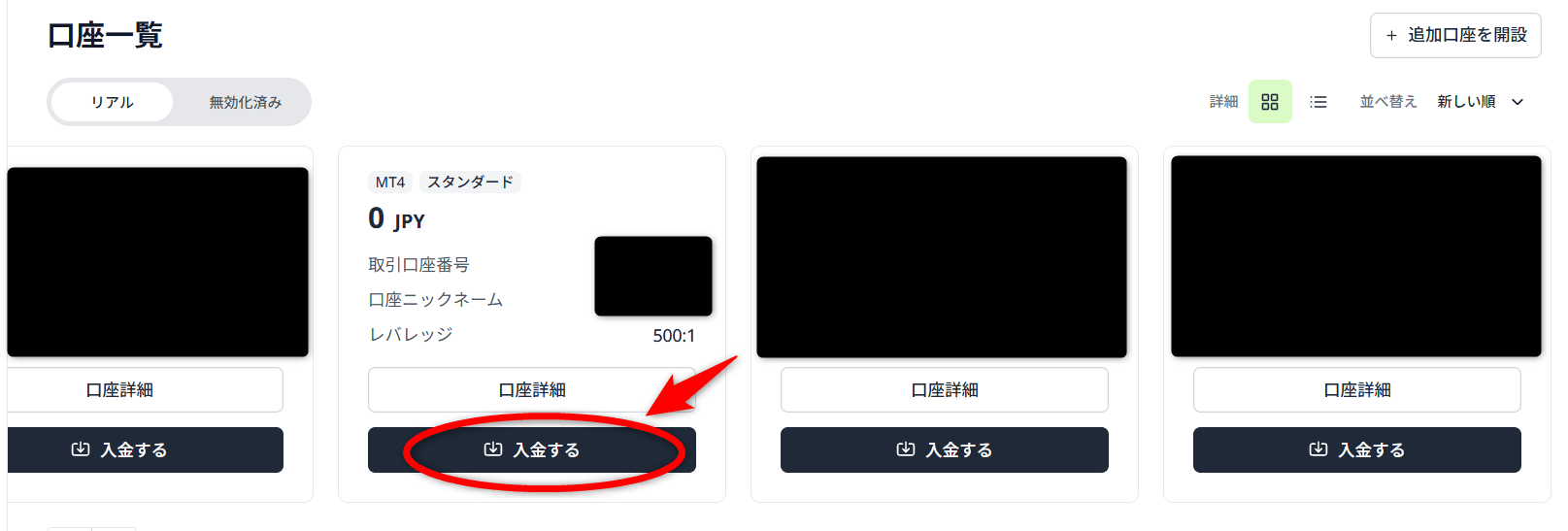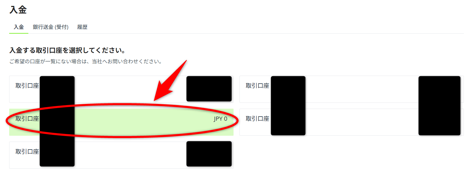 入金ページで改めて入金する取引口座をクリックします。