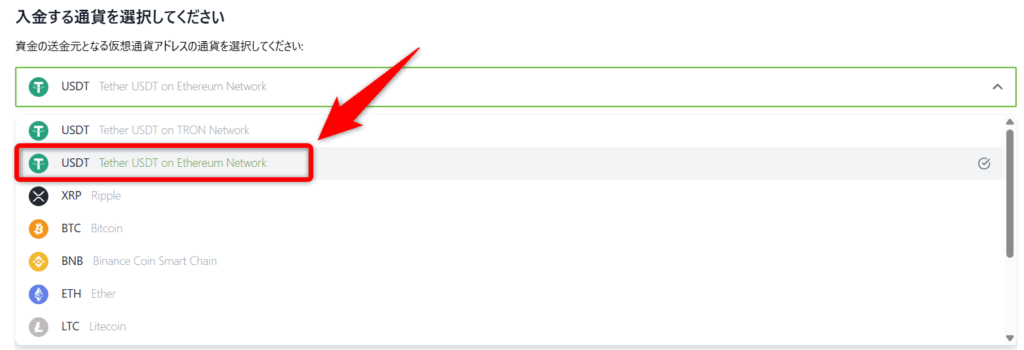 入金する通貨を選択しますが、ここでは「USDT Tether USDT on Ethereum Network」をクリックします。