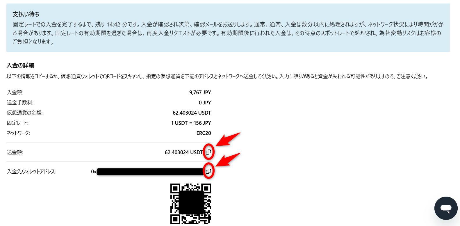 下記の画面になったら15分以内にメタマスクからUSDT(イーサリアム)を送金します。「送金額」「入金先ウォレットアドレス」はコピペして使います。