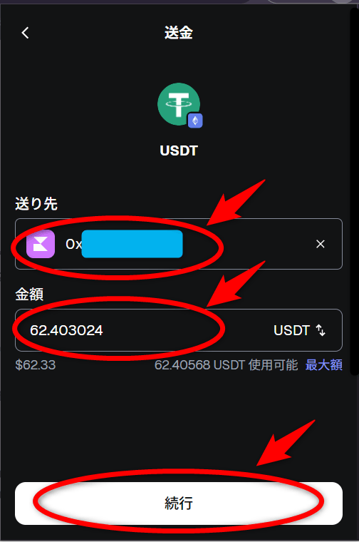 メタマスクの送金画面でUSDT(イーサリアム)を送金します。「送り先」「金額」にTitanFX会員ページに表示されてた「入金先ウォレットアドレス」「送金額」をコピペし、「続行」ボタンをクリックします。