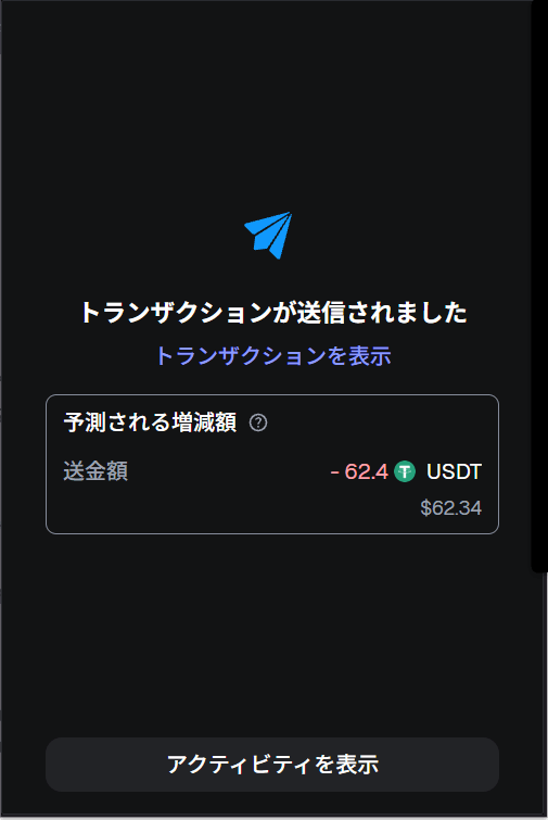 「確認」ボタンをクリックしたら送金処理が始まり、無事に送金が行われたら「トランザクションが送信されました」の画面が表示されます(※)。