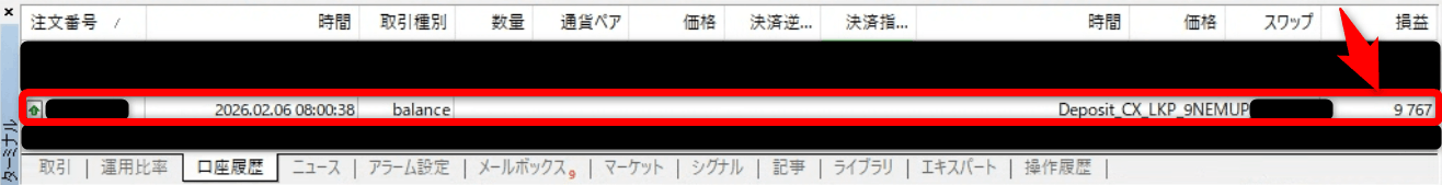 その後暫く待ってMT4の口座履歴で入金が反映されていれば一連の入金手続きは完了です。